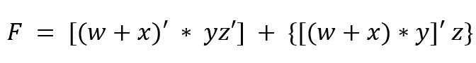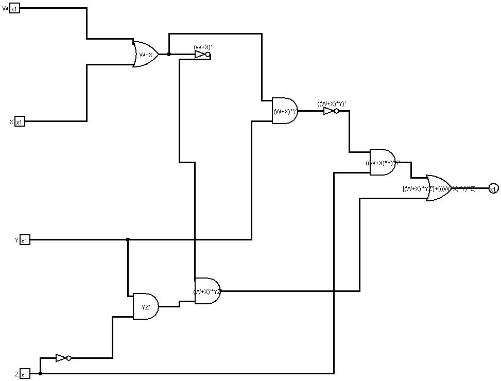 Para este ejemplo se puede observar que se tienen 3 sumas, 4 multiplicaciones y 2 negaciones, para ambos bloques se tienen las 3 operaciones, sin embargo se puede observar que se pueden reusar ciertas operaciones como la suma entre w y x, al realizar las conexiones correspondientes en el programa pudimos obtener la tabla de verdad, que es la siguiente: