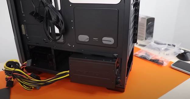 Abre el gabinete retirando los paneles laterales para acceder al interior, antes de colocar la fuente de alimentación, identifica el área designada, generalmente en la parte inferior trasera del gabinete. Decide si deseas orientar la fuente de alimentación con el ventilador hacia arriba o hacia abajo, según tus preferencias de flujo de aire y el diseño del gabinete.