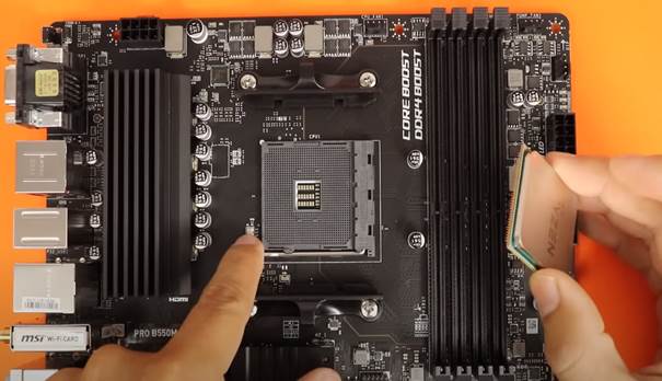 Con cuidado, baja el procesador en su lugar en el zócalo de la placa madre, no se debe aplicar fuerza ya que el procesador debería encajar suavemente en su posición si está correctamente alineado.