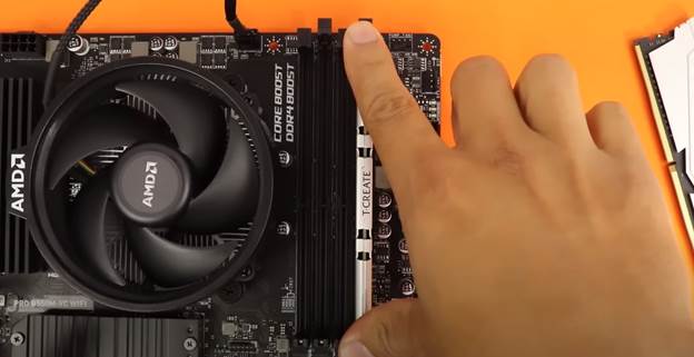 Observa el slot de la placa madre y la RAM, la RAM tiene una muesca en la parte inferior que coincide con una pestaña en el slot, alinea la muesca de la RAM con la pestaña del slot para asegurar que la RAM se inserte correctamente. Con un movimiento firme pero suave, presiona la RAM hacia abajo en el slot, esta debería encajar fácilmente en su lugar. Si se siente resistencia, asegúrate de que la RAM esté alineada correctamente y no la fuerces, si el slot tiene pestillos de retención, éstos se cerrarán automáticamente cuando la RAM esté completamente insertada.